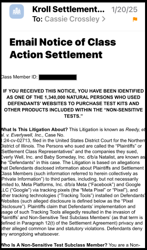 Here is an example I’ve received in email this year for a lab test I ordered in the past. The class member ID (which I blocked out) is a unique alphanumeric number assigned to an individual who is part of a legal case, such as a class action lawsuit. This ID is used by the settlement administrator to identify and track each person as they file a claim for compensation.